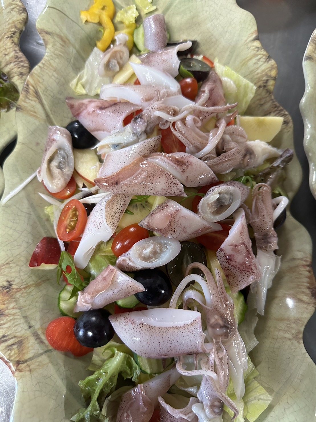 取材澎湖 新鮮小卷.稍加 川燙後.以美生菜.彩椒.各種新鮮水果片.小黃瓜..等等 多種綜合生菜.加上主廚特調和風醬汁